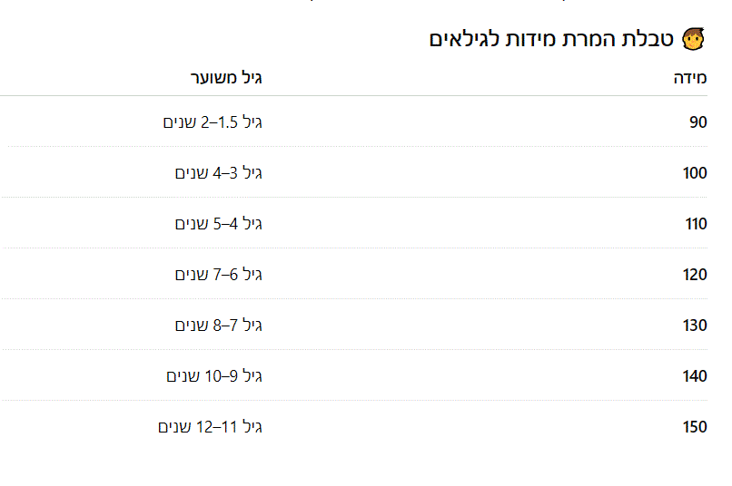 מידות 1.5-11 שנים לפי גובה הילד/ה